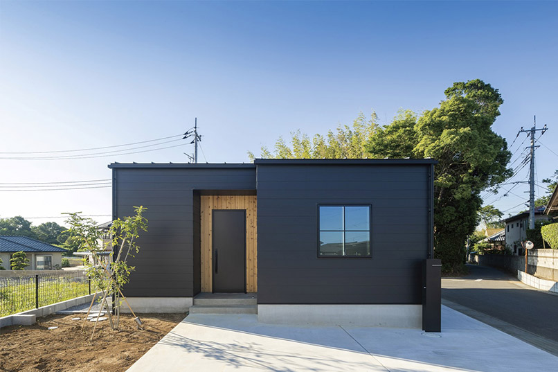 外壁は黒いガルバリウムをベースとし、無垢材のレッドシダーをアクセントに採用することで、どこか温もりを感じる外観に。夜間に光がもれる格子窓も建物にかわいらしい印象を与えてくれます。