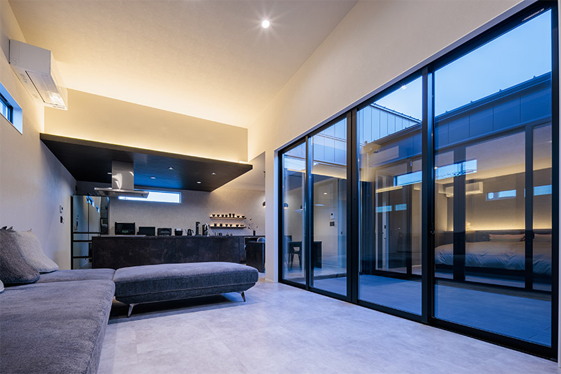 建物の中心に中庭を設けることで、外側に大きな窓をつくらなくても光を取り込むことが可能となり、同時に外部からの目線を気にせず開放感のある室内を実現できました。外観はブラックのガルバリウムとレッドシダーでメリハリのある印象に。
